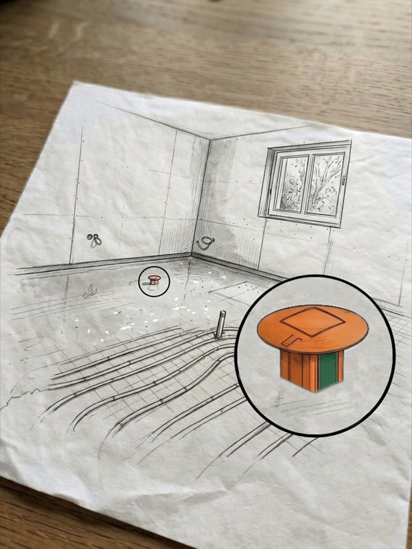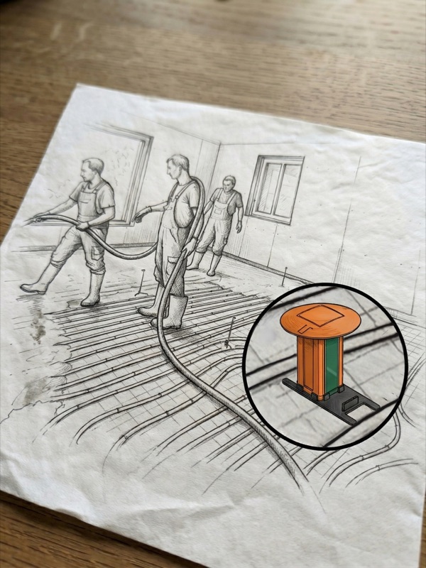 Der Sensor — bestehend aus dem Messrohr und der wiederverwendbaren Sendeeinheit — wird in den noch frischen Estrich (Fließestrich oder erdfeuchter Estrich) eingesteckt und ggfs. mit einer Bodenplatte fixiert.